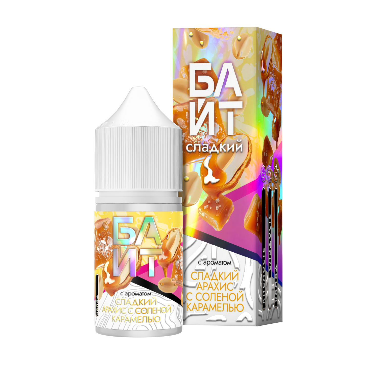 БАЙТ Сладкий арахис с солёной карамелью - ароматизатор для вейпа в объёме 13 мл. Для получения готовой для использования жидкости нужно добавить только глицерин (VG), на выходе получится 30 мл.