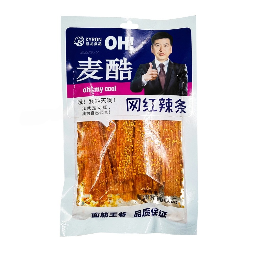 Mianjinwangye Maiku - пряный снек весом 172 гр. Производится в Китае из пшеницы и сои с добавлением специй, острого перца чили, семян кунжута и масла для яркого вкуса и аромата. В отличие от воздушных хрустящих чипсов, латяо имеют мягкую, тягучую и жевательную текстуру.