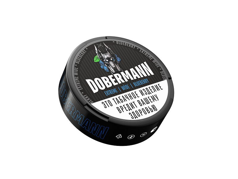 DOBERMANN WIDE Blueberry - жевательный табак весом 11 гр. Шайба содержит 19 паучей высококачественного табака высокой крепости.