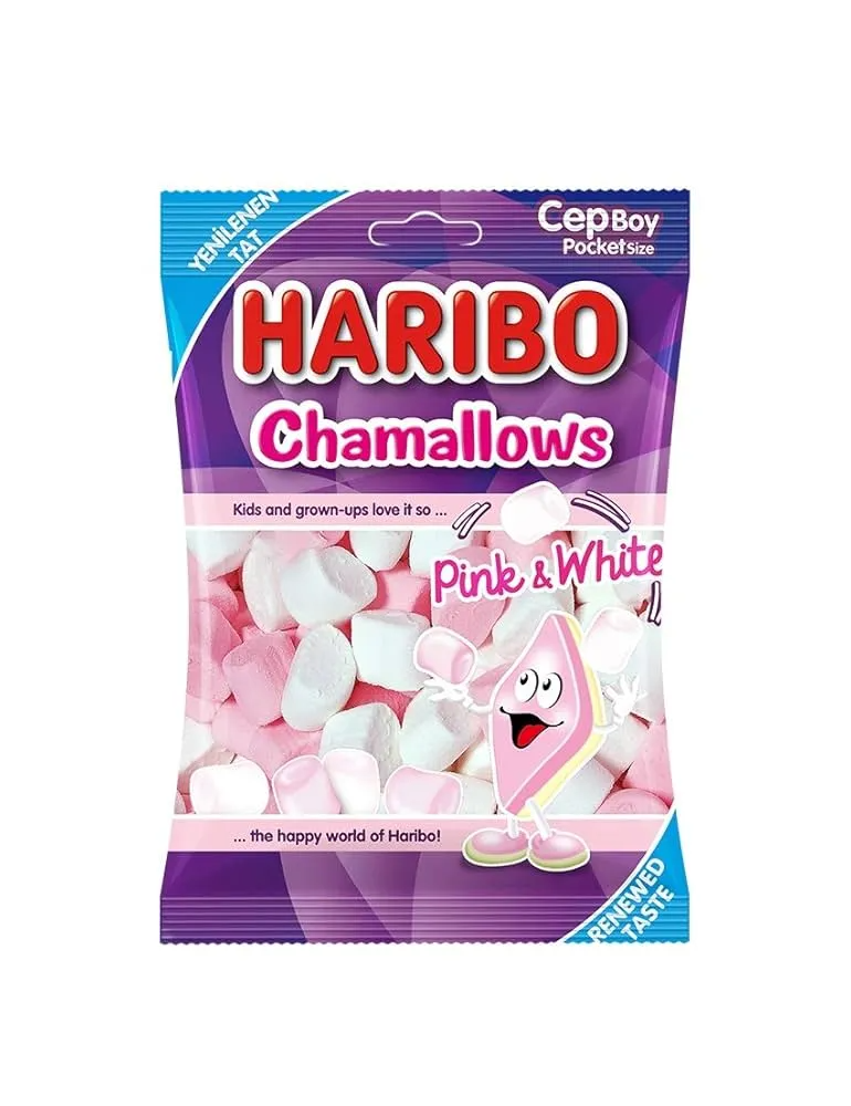 Haribo Chamallows Pink & White - маршмэллоу весом 150 гр. Произведено в Турции из качественных ингредиентов. В одной упаковке 24 шт.
