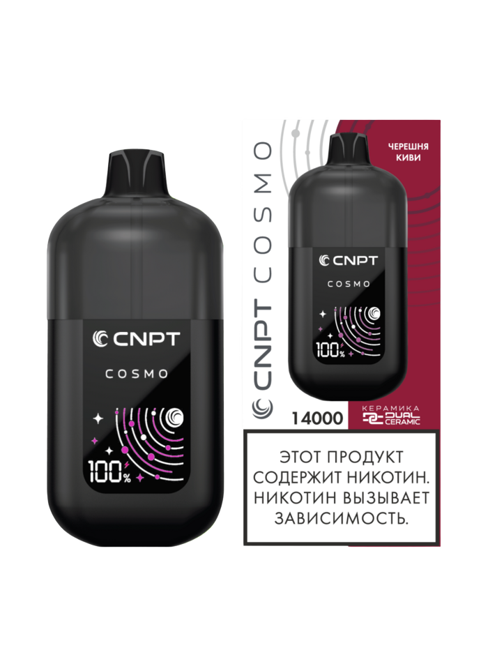 Одноразка CNPT COSMO Черешня Киви рассчитана на 14000 тяг. Корпус устройства выполнен в минималистичном дизайне из прочного пластика с soft-touch покрытием. Девайс оснащен уникальным двойным керамическим нагревателем DUAL CERAMIC и HD-экраном с анимацией процесса парения и заряда батареи. АКБ имеет ёмкость 780 mAh. В бак заправлено 15 мл жидкости.