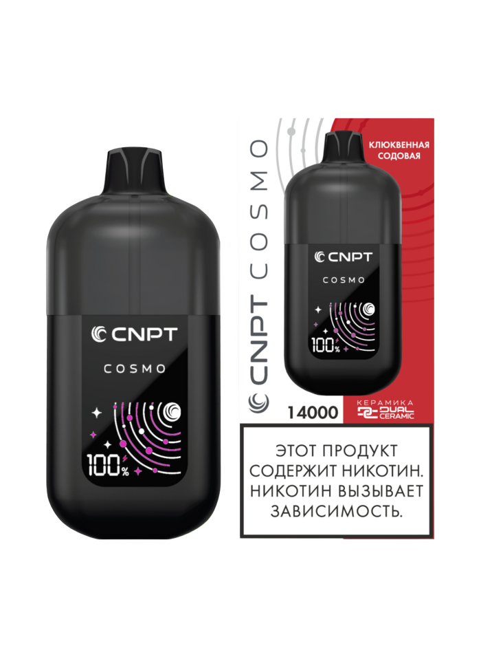 Одноразка CNPT COSMO Клюквенная Cодовая рассчитана на 14000 тяг. Корпус устройства выполнен в минималистичном дизайне из прочного пластика с soft-touch покрытием. Девайс оснащен уникальным двойным керамическим нагревателем DUAL CERAMIC и HD-экраном с анимацией процесса парения и заряда батареи. АКБ имеет ёмкость 780 mAh. В бак заправлено 15 мл жидкости.