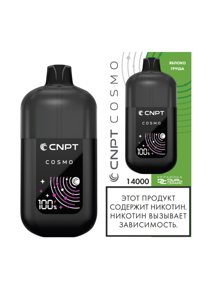 Одноразка CNPT COSMO Яблоко Груша рассчитана на 14000 тяг. Корпус устройства выполнен в минималистичном дизайне из прочного пластика с soft-touch покрытием. Девайс оснащен уникальным двойным керамическим нагревателем DUAL CERAMIC и HD-экраном с анимацией процесса парения и заряда батареи. АКБ имеет ёмкость 780 mAh. В бак заправлено 15 мл жидкости.