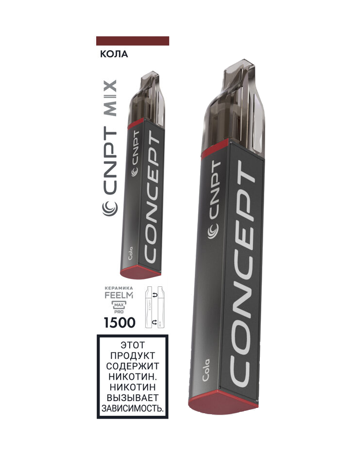 Одноразка CNPT MIX Кола рассчитана на 1500 тяг. Корпус устройства выполнен в минималистичном дизайне в форм-факторе стика. Имеет уникальное магнитное крепление, которое позволяет соединять 2 девайса в 1 и миксовать вкусы из линейки по своему желанию. Ёмкость АКБ составляет 500 mAh. В бак заправлено 2 мл жидкости.