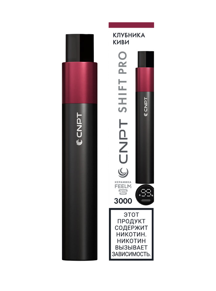 Одноразка CNPT SHIFT PRO - Клубника Киви рассчитана на 3000 тяг. Корпус девайса выполнен в форме стика и имеет строгий минималистичный дизайн. На нижней грани устройства расположен дисплей, отображающий уровень заряда и мощность. Девайс может работать в режиме Boost с увеличенной мощностью парения. Объем предзаправленной жидкости в баке составляет 5 мл. Встроенный АКБ на 650 mAh можно подзаряжать через USB Type-C.