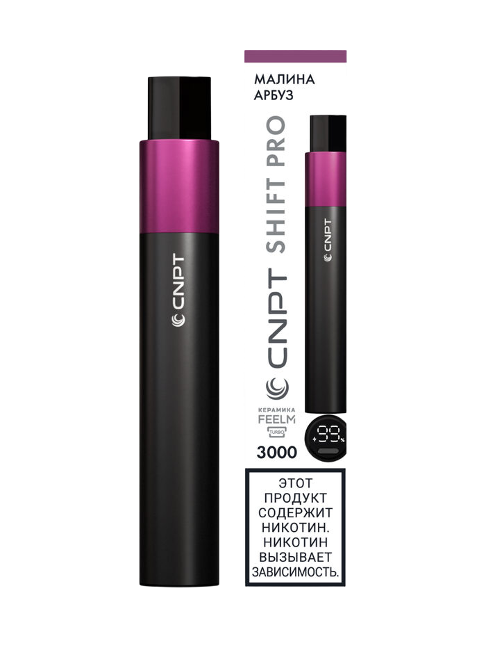 Одноразка CNPT SHIFT PRO - Малина Арбуз рассчитана на 3000 тяг. Корпус девайса выполнен в форме стика и имеет строгий минималистичный дизайн. На нижней грани устройства расположен дисплей, отображающий уровень заряда и мощность. Девайс может работать в режиме Boost с увеличенной мощностью парения. Объем предзаправленной жидкости в баке составляет 5 мл. Встроенный АКБ на 650 mAh можно подзаряжать через USB Type-C.
