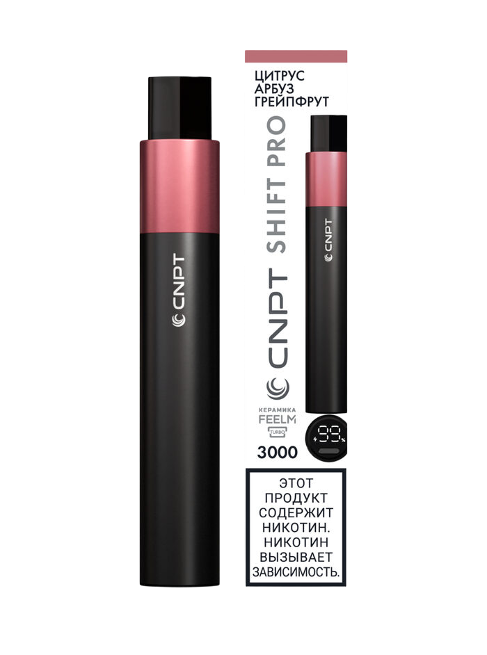 Одноразка CNPT SHIFT PRO - Цитрус Арбуз Грейпфрут рассчитана на 3000 тяг. Корпус девайса выполнен в форме стика и имеет строгий минималистичный дизайн. На нижней грани устройства расположен дисплей, отображающий уровень заряда и мощность. Девайс может работать в режиме Boost с увеличенной мощностью парения. Объем предзаправленной жидкости в баке составляет 5 мл. Встроенный АКБ на 650 mAh можно подзаряжать через USB Type-C.