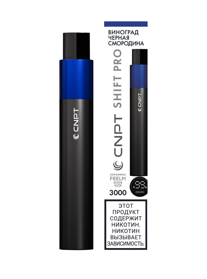 Одноразка CNPT SHIFT PRO - Виноград Черная Смородина рассчитана на 3000 тяг. Корпус девайса выполнен в форме стика и имеет строгий минималистичный дизайн. На нижней грани устройства расположен дисплей, отображающий уровень заряда и мощность. Девайс может работать в режиме Boost с увеличенной мощностью парения. Объем предзаправленной жидкости в баке составляет 5 мл. Встроенный АКБ на 650 mAh можно подзаряжать через USB Type-C.