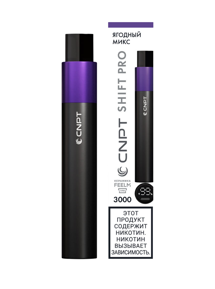 Одноразка CNPT SHIFT PRO - Ягодный Микс рассчитана на 3000 тяг. Корпус девайса выполнен в форме стика и имеет строгий минималистичный дизайн. На нижней грани устройства расположен дисплей, отображающий уровень заряда и мощность. Девайс может работать в режиме Boost с увеличенной мощностью парения. Объем предзаправленной жидкости в баке составляет 5 мл. Встроенный АКБ на 650 mAh можно подзаряжать через USB Type-C.