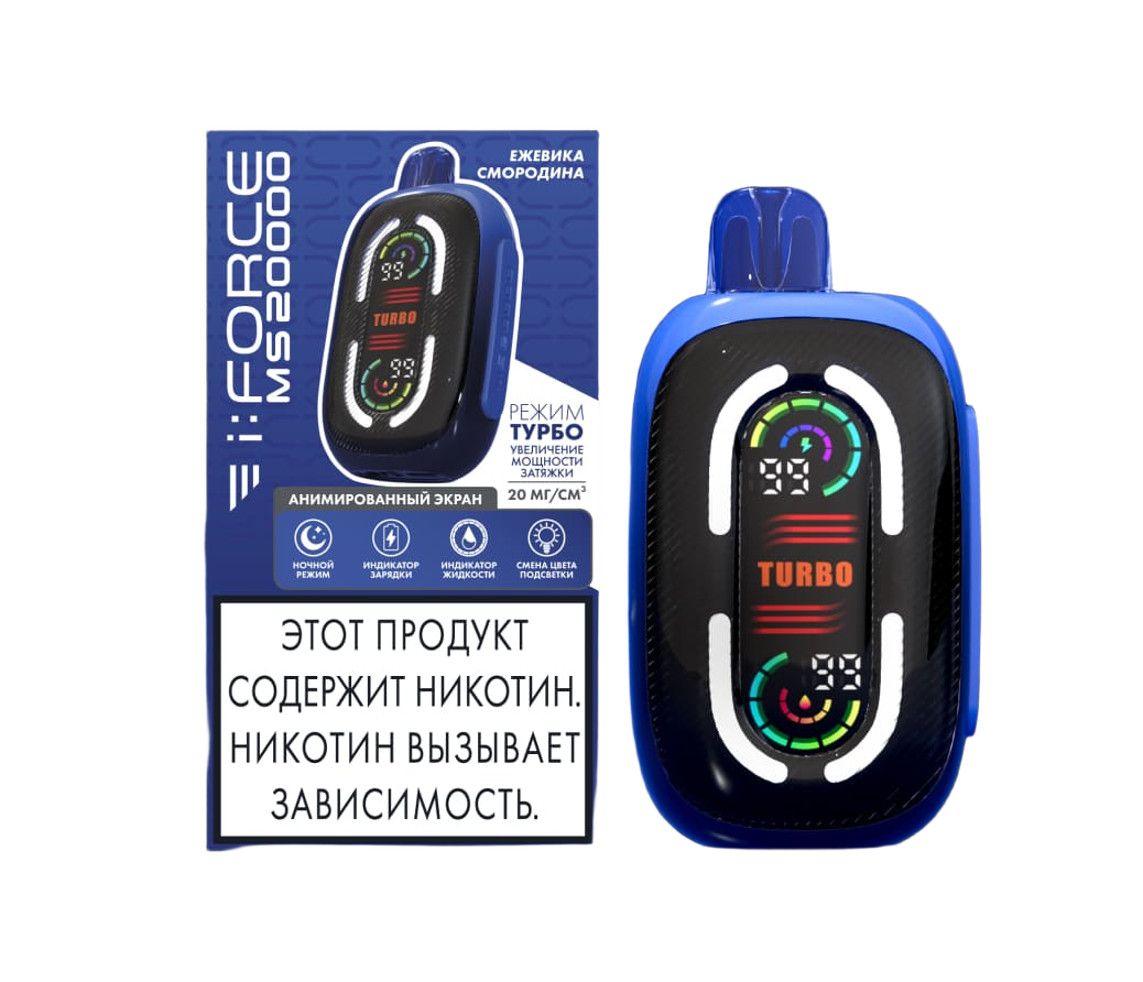 Одноразка i:FORCE MS20000 Ежевика Смородина рассчитана на 20000 тяг. Корпус устройства выполнен в ярком дизайне. На лицевой стороне расположен LED-дисплей, отображающий уровень заряда батареи, остаток жидкости и выбранный режим. Для дисплея предусмотрена смена цвета подсветки и переключение в ночной режим. Девайс может работать в режиме Turbo с увеличенной мощностью парения. Объем предзаправленной жидкости в баке составляет 19 мл. Встроенный АКБ на 850 mAh можно подзаряжать через USB Type-C.