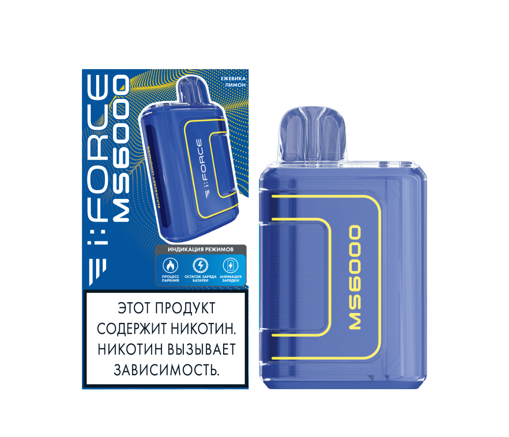 Одноразка i:FORCE MS6000 Ежевика Лимон рассчитана на 6000 тяг. Корпус устройства выполнен в ярком и броском дизайне. На нижней грани девайса расположены LED-индикаторы процесса работы и уровня заряда. Объем предзаправленной жидкости в баке составляет 6 мл. Встроенный АКБ на 550 mAh можно подзаряжать через USB Type-C.