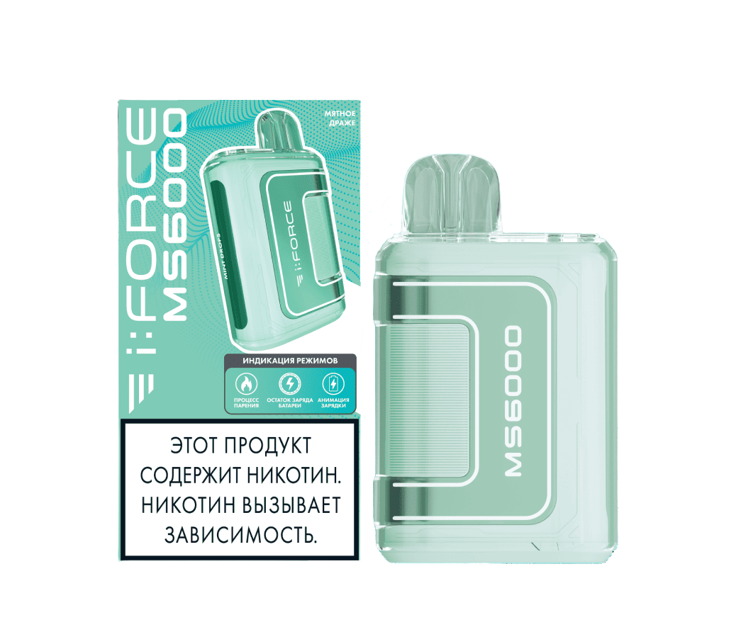 Одноразка i:FORCE MS6000 Мятное Драже рассчитана на 6000 тяг. Корпус устройства выполнен в ярком и броском дизайне. На нижней грани девайса расположены LED-индикаторы процесса работы и уровня заряда. Объем предзаправленной жидкости в баке составляет 6 мл. Встроенный АКБ на 550 mAh можно подзаряжать через USB Type-C.