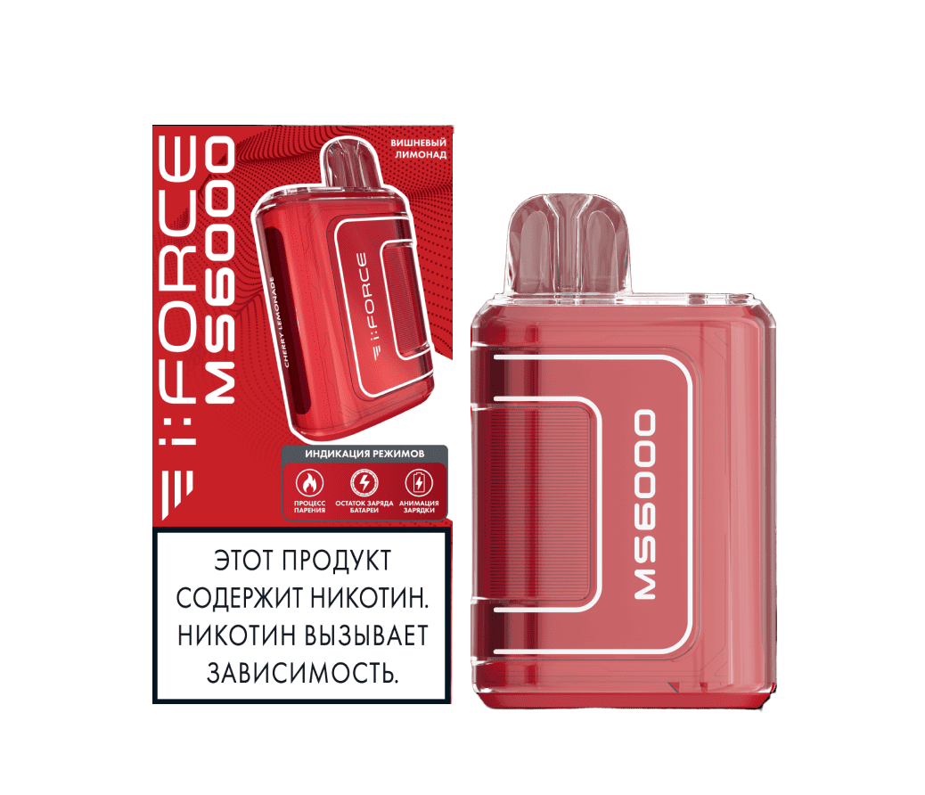 Одноразка i:FORCE MS6000 Вишнёвый Лимонад рассчитана на 6000 тяг. Корпус устройства выполнен в ярком и броском дизайне. На нижней грани девайса расположены LED-индикаторы процесса работы и уровня заряда. Объем предзаправленной жидкости в баке составляет 6 мл. Встроенный АКБ на 550 mAh можно подзаряжать через USB Type-C.