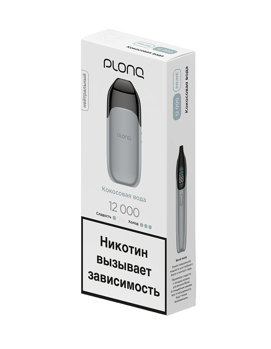 Одноразка PLONQ Prime Кокосовая Вода рассчитана на 12000 тяг. Устройство имеет тонкий металлический корпус с плавными линиями. LED-экран интегрирован в боковую часть устройства и отображает уровень жидкости, заряд батареи и выбранный режим. Девайс включается двойным нажатием кнопки. Одинарное нажатие активирует экран и переключает работу устройства в режим Boost. Встроенный АКБ имеет ёмкость 750 mAh. В бак предзаправлено 14 мл жидкости.