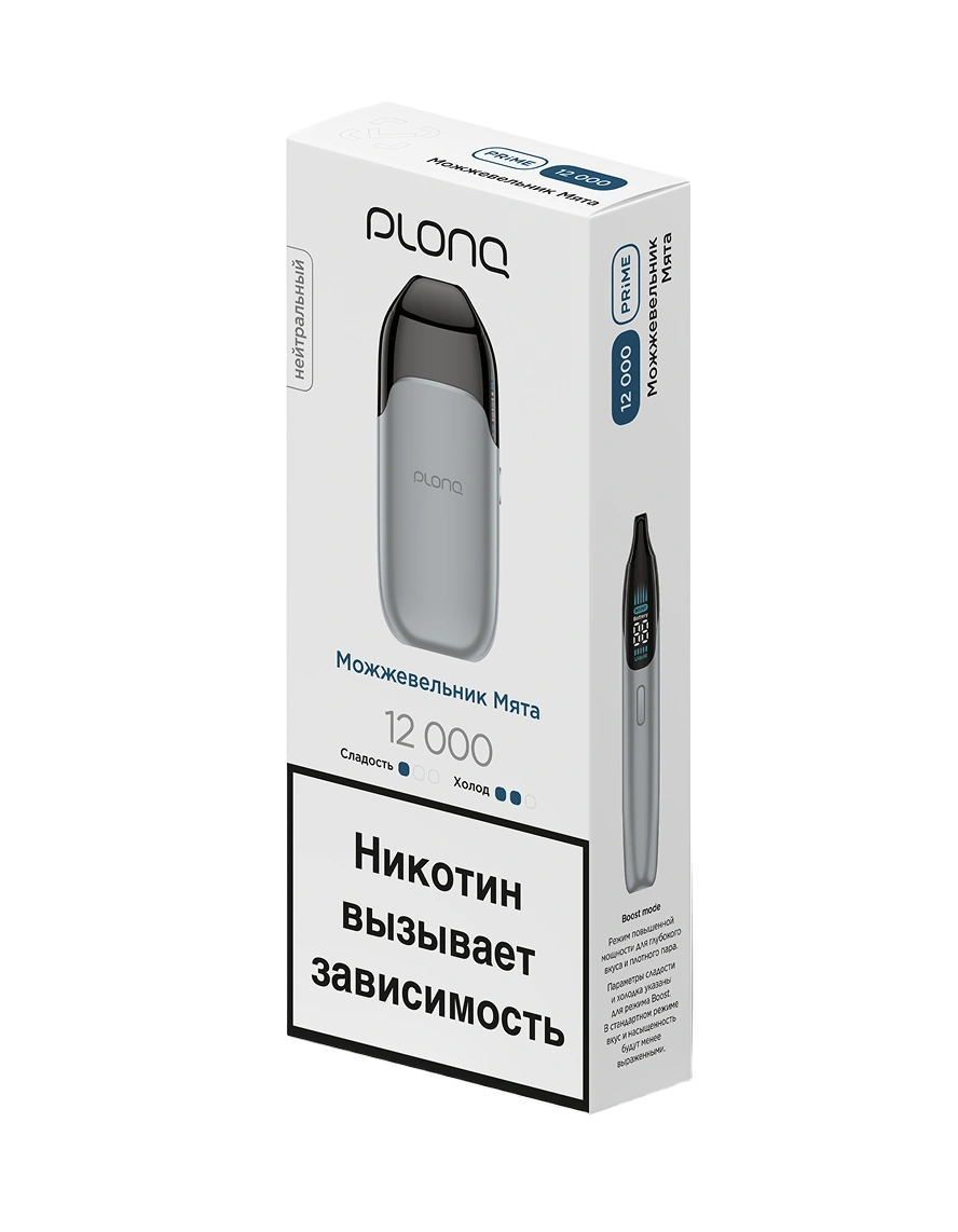 Одноразка PLONQ Prime Можжевельник Мята рассчитана на 12000 тяг. Устройство имеет тонкий металлический корпус с плавными линиями. LED-экран интегрирован в боковую часть устройства и отображает уровень жидкости, заряд батареи и выбранный режим. Девайс включается двойным нажатием кнопки. Одинарное нажатие активирует экран и переключает работу устройства в режим Boost. Встроенный АКБ имеет ёмкость 750 mAh. В бак предзаправлено 14 мл жидкости.