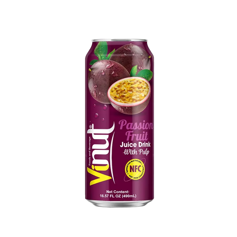 Vinut Маракуйя с мякотью - безалкогольный негазированный напиток объёмом 490 мл. В составе содержится 55% натурального сока и мякоть фруктов. В одной упаковке 24 шт.